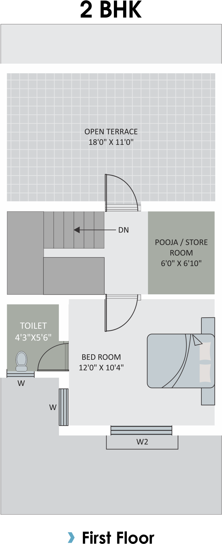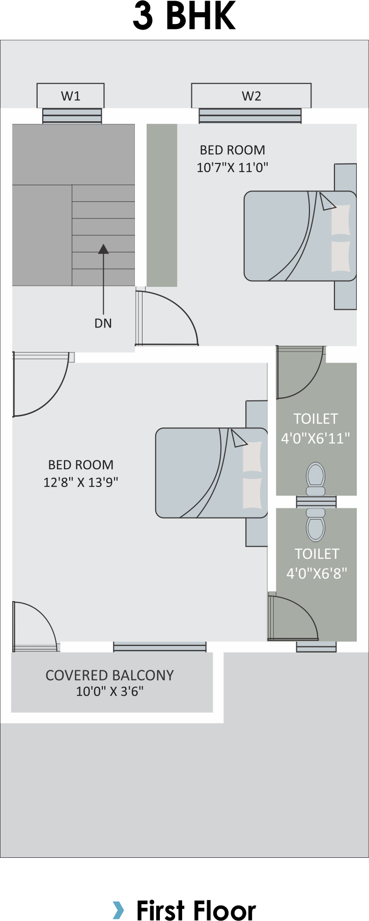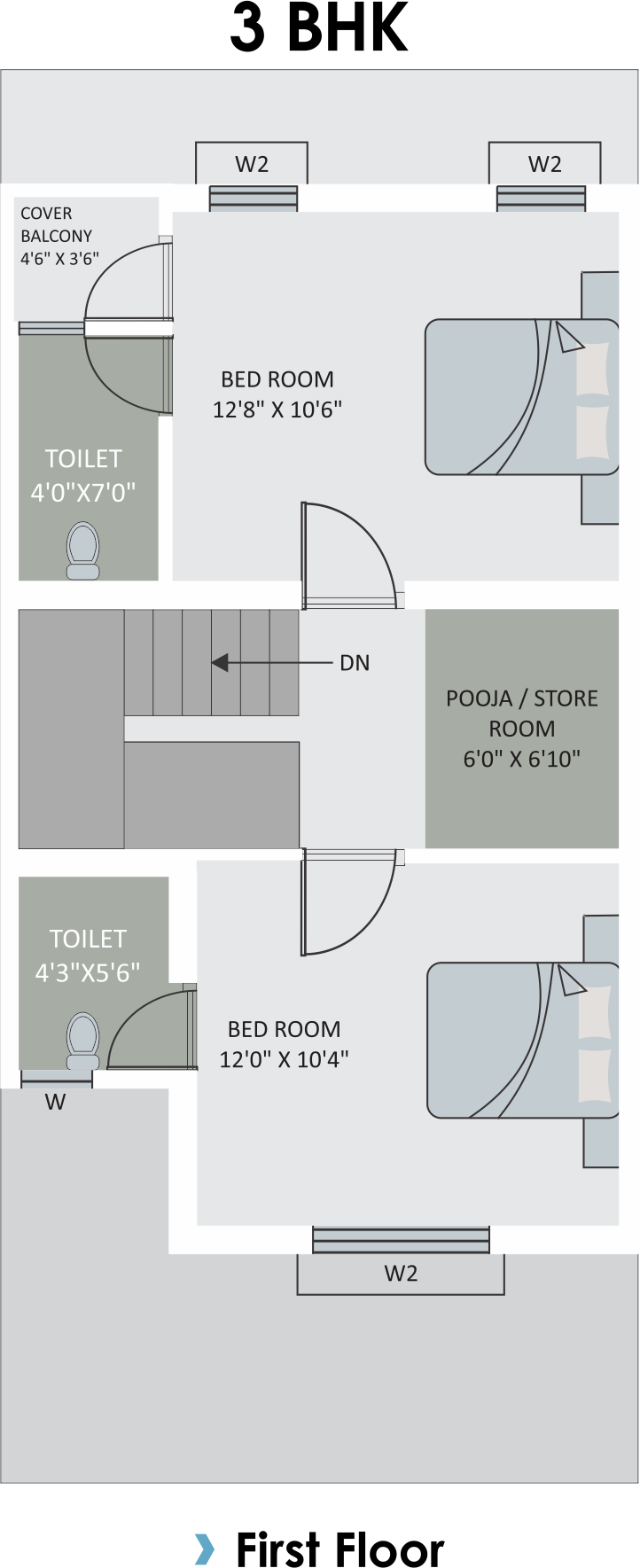 Vitrified Tiles (2 x 2) in all Rooms, Glaze Tiles in all Bathrooms & Toilets.